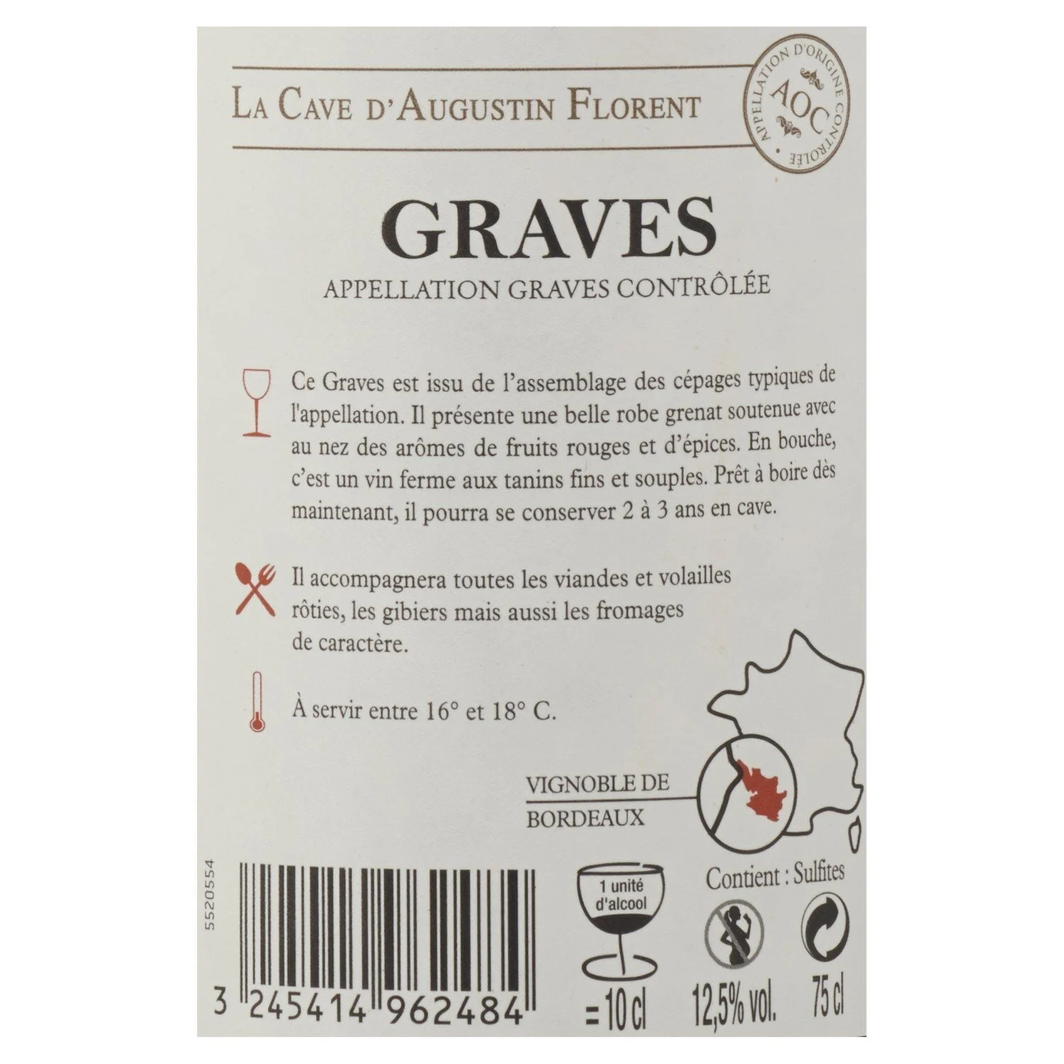 Découvrez ce Grand Vin de Bordeaux, issu de l’assemblage des cépages typiques de l’appellation Graves. Avec sa belle robe grenat soutenue et ses arômes de fruits rouges et d’épices, ce vin ferme aux tanins fins et souples accompagnera parfaitement vos plats de viandes et volailles rôties, gibiers et fromages de caractère. Prêt à boire dès maintenant, il pourra également se conserver 2 à 3 ans en cave. Un incontournable pour les amateurs de vins rouges de caractère. Millésime, médailles et Degré d’alcool : En fonction du Drive sélectionné, le millésime et le degré d’alcool indiqués sur le site peuvent être différents de ceux qui vous seront réellement livrés